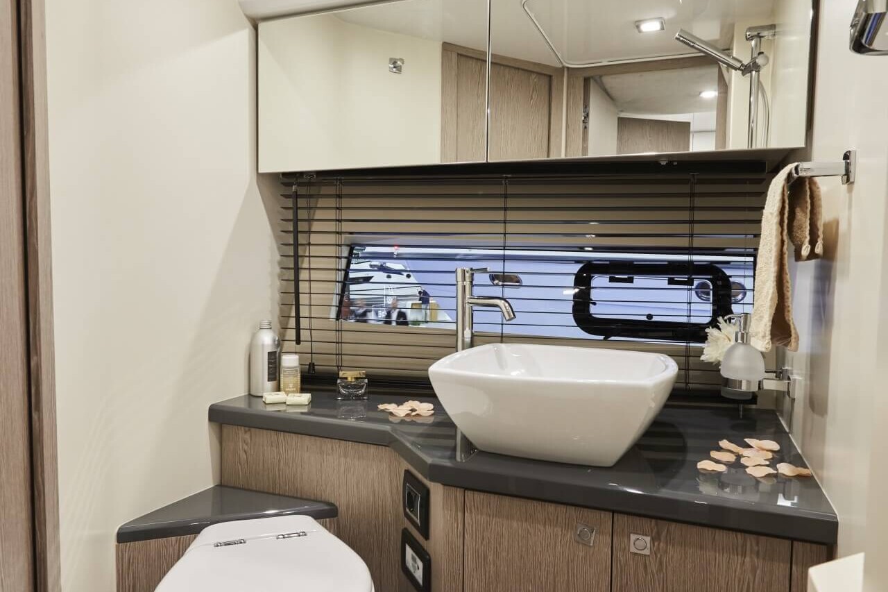 • Jacht posiada hydrauliczną platformę z prysznicem na rufie.