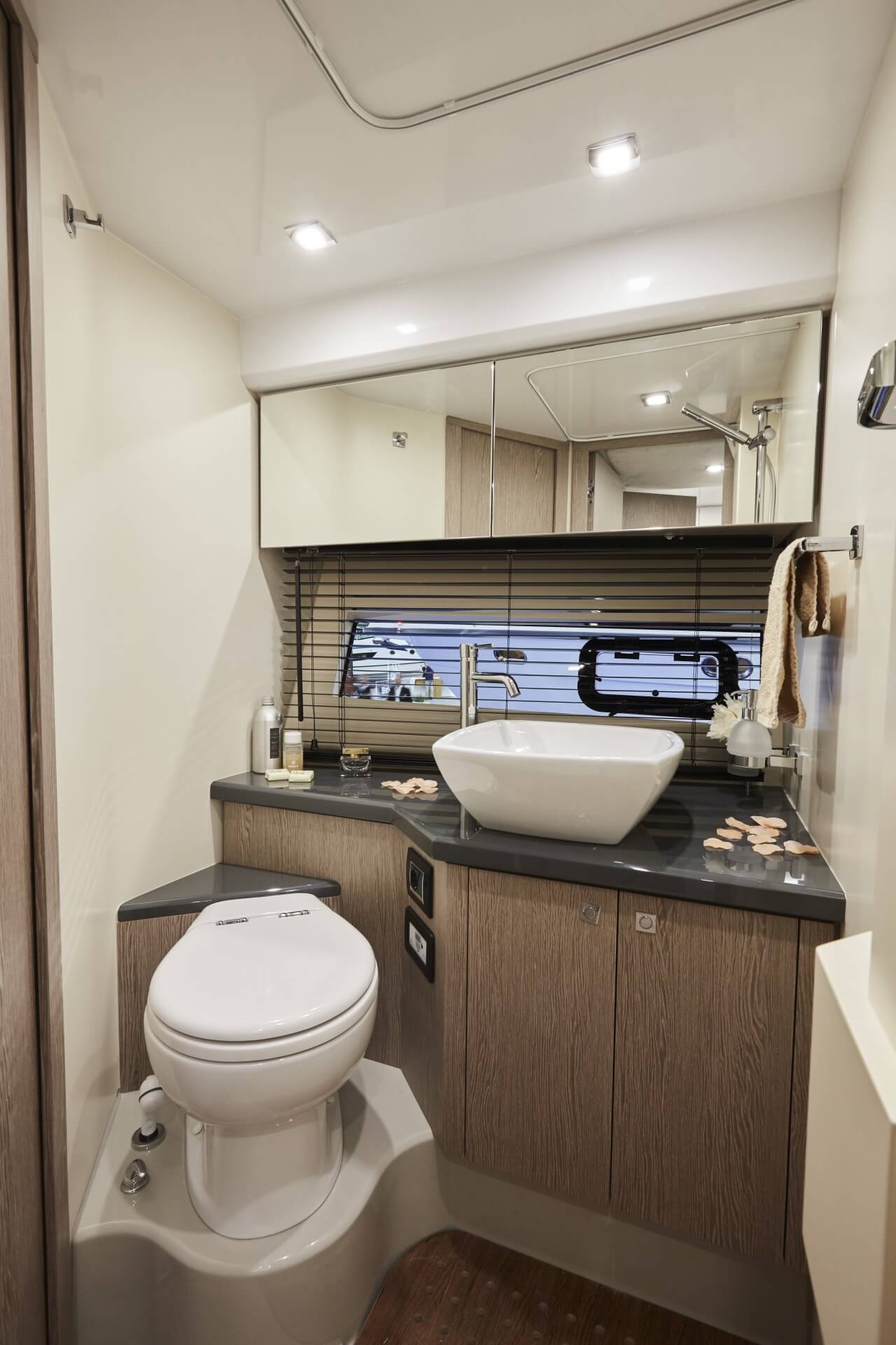 • Jacht posiada hydrauliczną platformę z prysznicem na rufie.